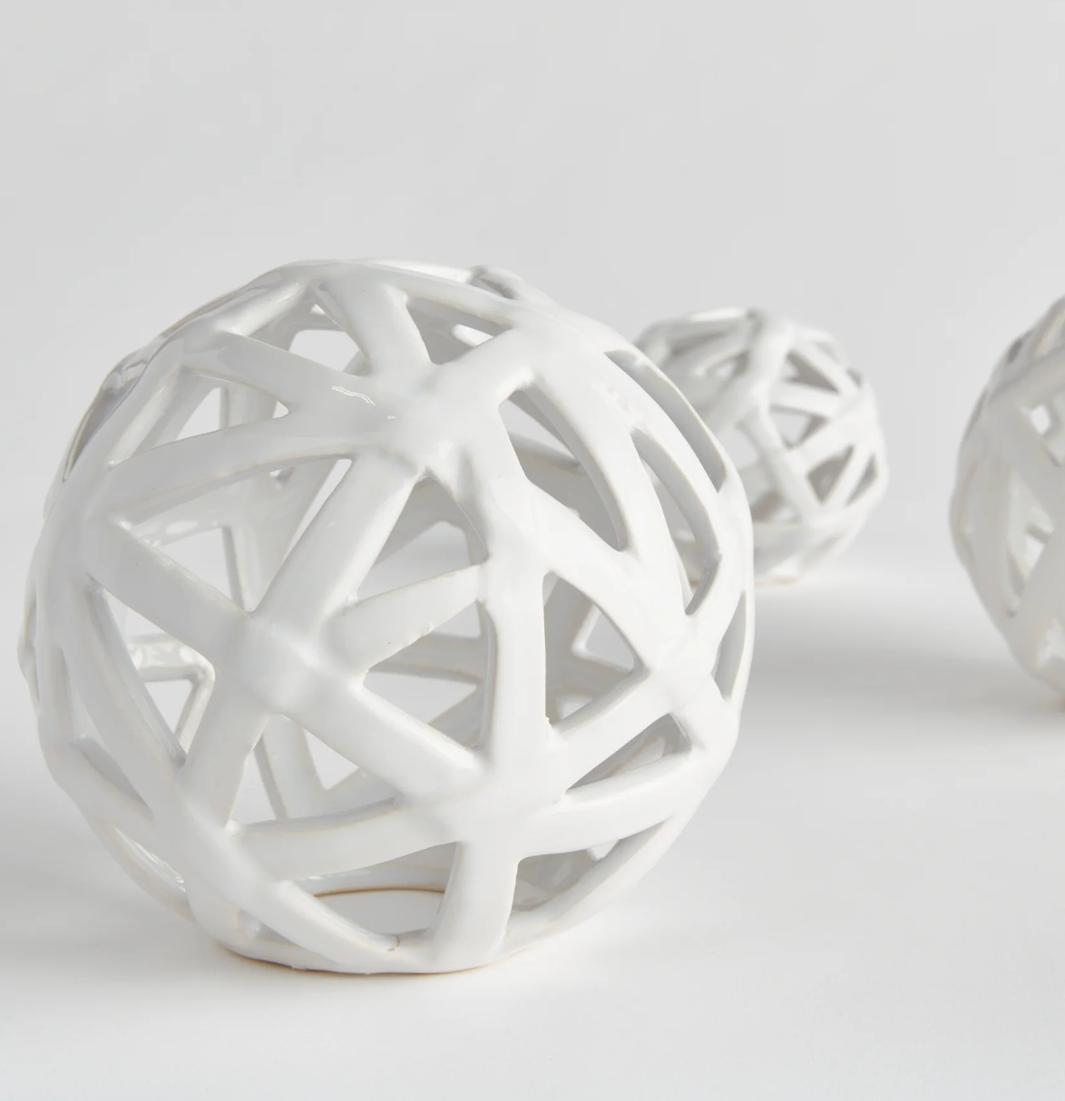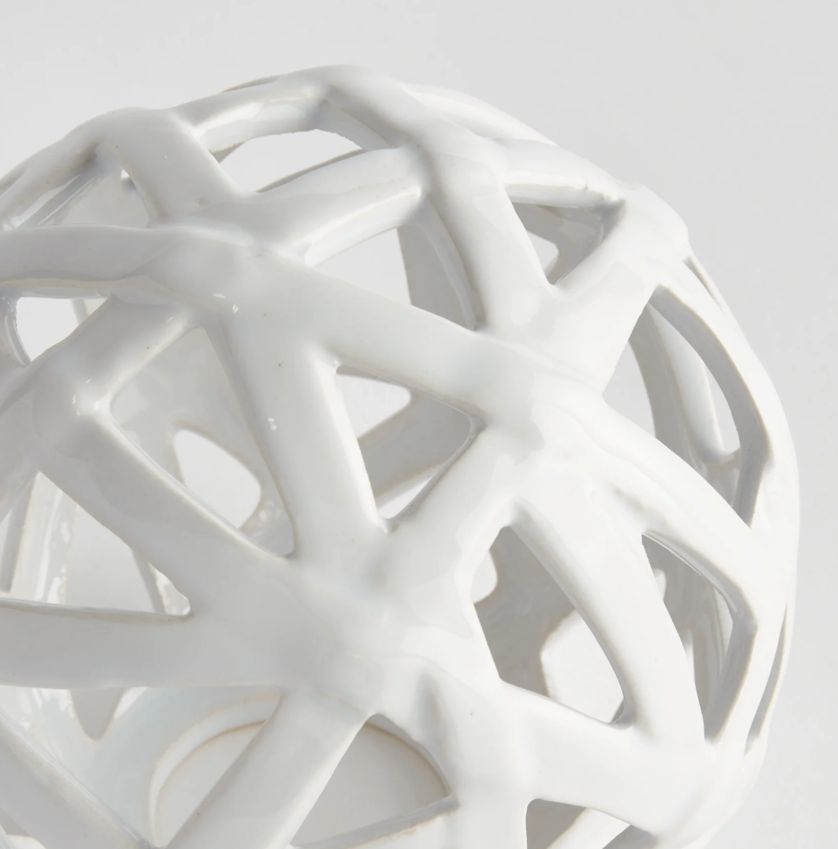 This contemporary little orb is made of thin ceramic strips giving it an open feel. It is perfect in a wide open bowl or tray.
