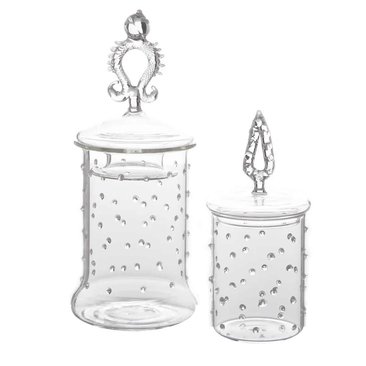 A set of two glass apothecary jars with decorative lids, one large and one small. Small glass dots are applied on the body. Great vanity set. Height: 8.5" Large / 5.5" Small Diameter: 3.5" Large / 2.75" Small