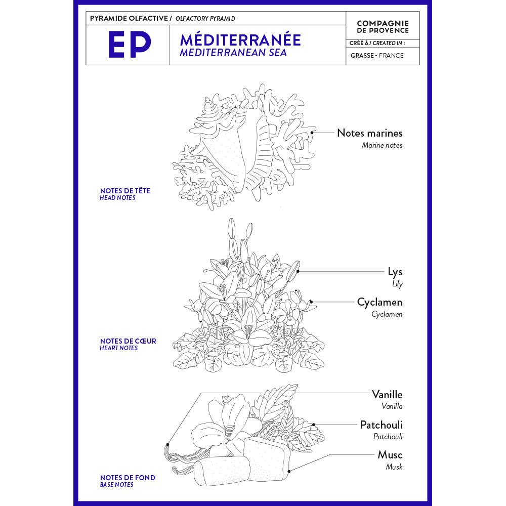 Fragrance of the Mediterranean air combined with the freshness of sea spray with delicate scents of sunny flowers, created in Grasse. Glass pump bottle.