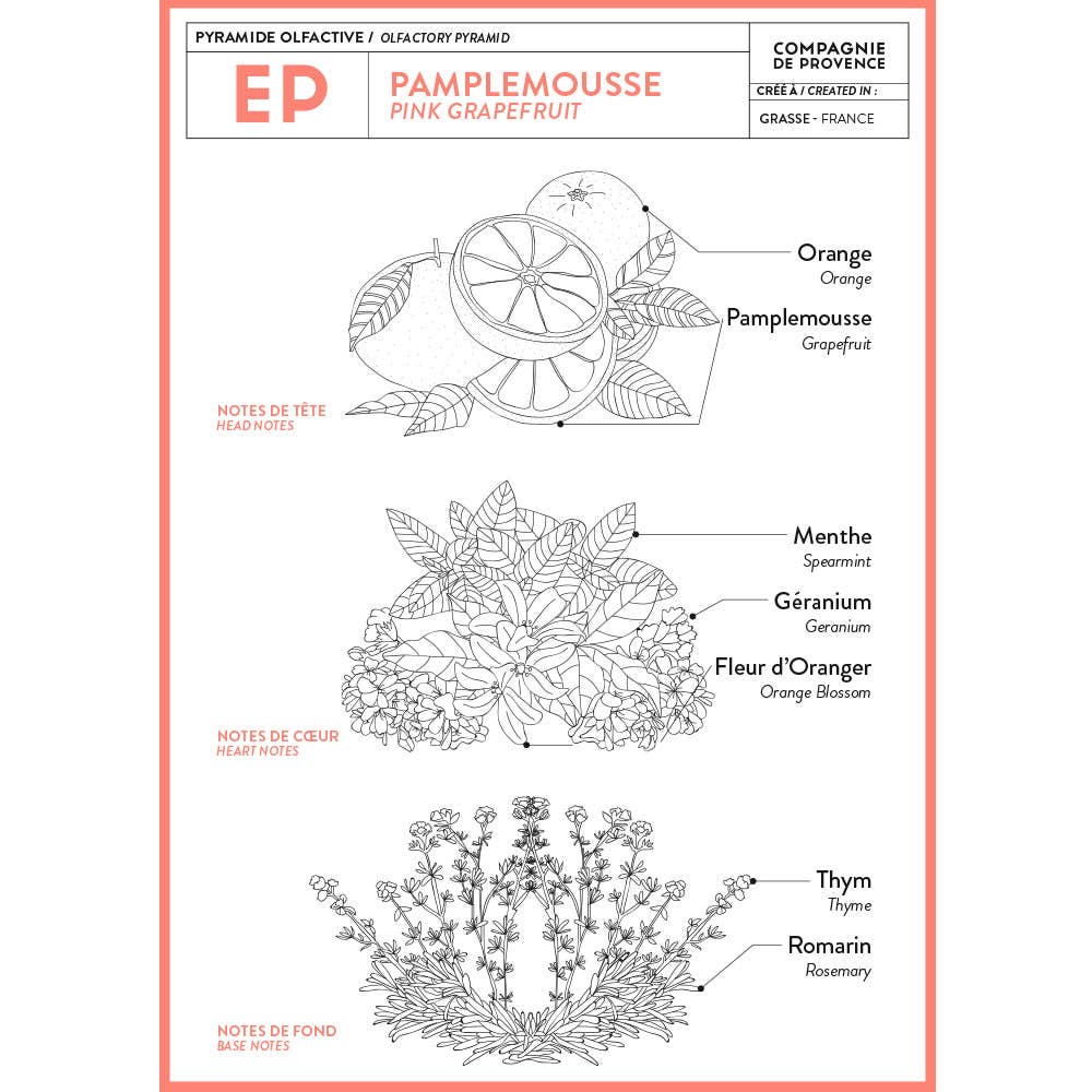 A scent of fresh fruit with notes of pink grapefruit bursting with sunshine, created in Grasse. Glass pump bottle.