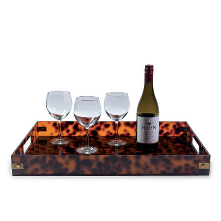 Sometimes you need that statement tray to make it all happen. The Milan rectangle tortoise tray is just that! Dramatic and ever so uber chic with the all-over translucent tortoise acrylic, the tray is accented with 'campaign style' aged brass metal corner hardware and a cut out end handle for ease when serving drinks.
